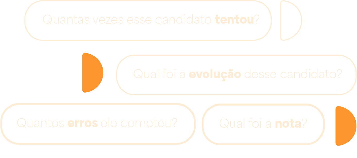 Acompanhe a evolução dos candidatos em tempo real analisando o número de tentativas, erros, e a pontuação final para garantir a contratação dos melhores talentos para a sua empresa.